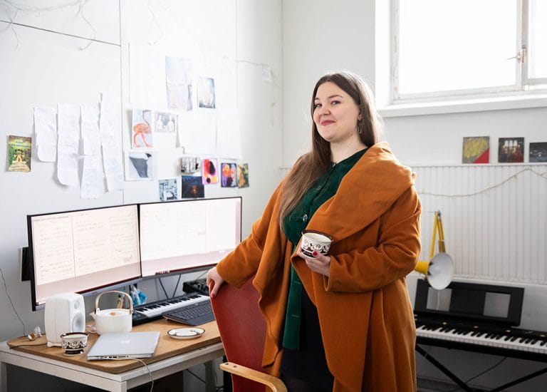 Aino Tenkanen säveltää kahdeksan neliön kopissa, mutta ei erakoidu neljän seinän sisään. Työ on yhteistyötä. Tenkanen työskenteli vuonna 2024 Kordelinin säätiön tuella.