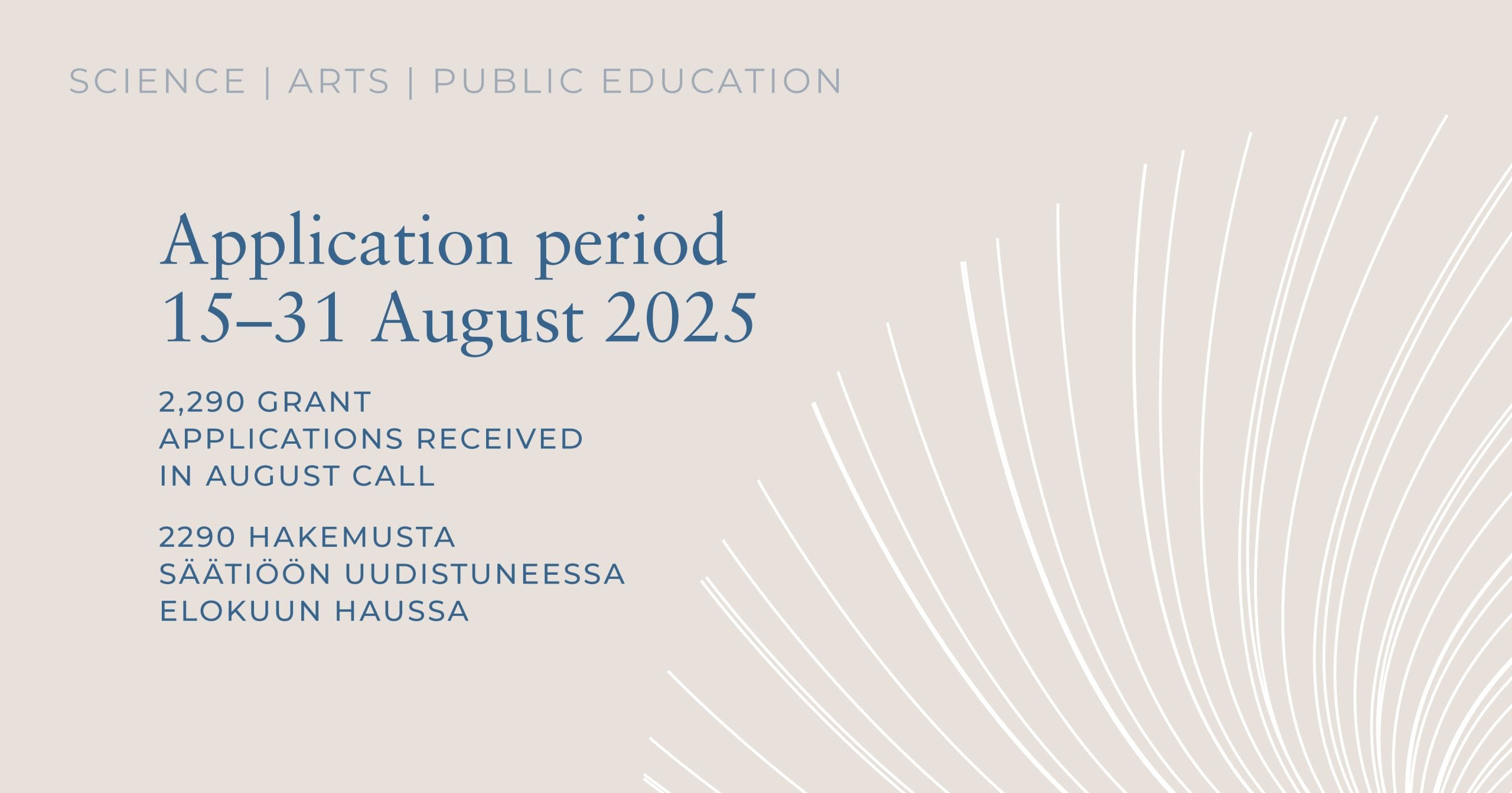 The Alfred Kordelin Foundation’s August grant call closed on Sunday, August 31, at 4:00 p.m. The Foundation received a total of 2,290 applications: 334 in science, 1573 in the arts, and 383 in public education. We warmly thank all applicants.