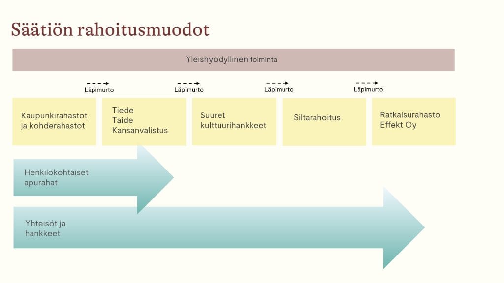 Säätiön erilaiset apurahamuodot mahdollistavat hankkeen kasvamisen kaupunkirahastoista kaksivuotiseksi työskentelyksi ja lopulta Suureksi kulttuurihankkeeksi tai vaikuttavuusrahoittamisen kautta siivilleen nousevaksi toiminnaksi. Tavoitteenamme on elinvoimainen ja itseään kannatteleva kulttuurikenttä, joka rikastuttaa yhteiskuntaa kestävällä tavalla.