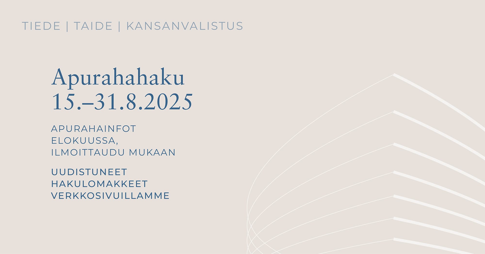 - Taiteen apurahoja myönnetään eri aloille vuorovuosittain. Tänä vuonna hakuvuorossa ovat visuaaliset taiteet, musiikki sekä arkkitehtuuri ja taideteollisuus, ensi vuonna 2026 kirjallisuus ja näyttämötaiteet. Yksityishenkilöiden lisäksi myös yhteisöt voivat hakea taiteen apurahoja.
